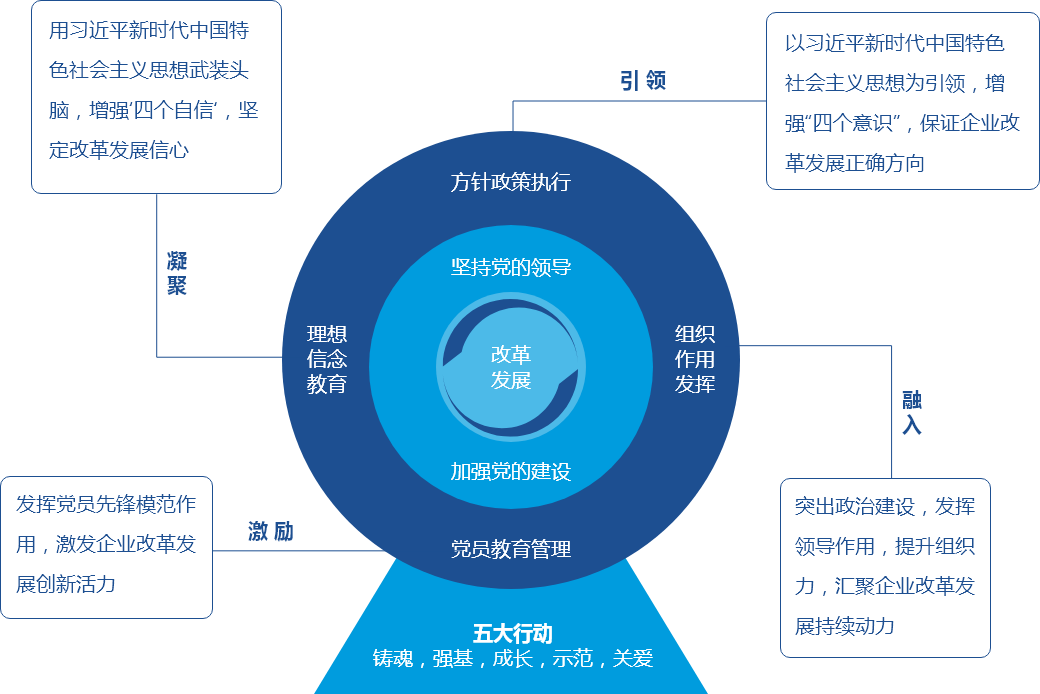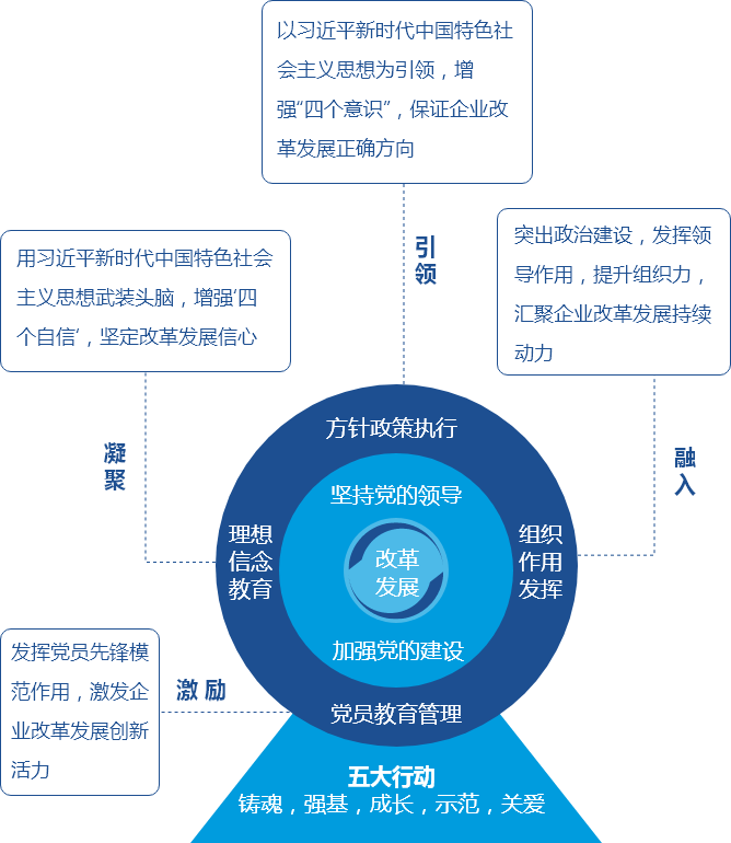 總體思路是:聚焦一個目標、遵循兩個規律、堅持三個原則、突出四個重點、實施五大行動。即,聚焦促進企業改革發展“一個目標”,遵循企業發展和黨建工作“兩個規律”,堅持黨的領導、融入中心、分級管理“三個原則”,突出方針政策執行、理想信念教育、黨組織作用發揮、黨員教育管理“四個重點”,實施鑄魂、強基、成長、示范、關愛“五大行動”。