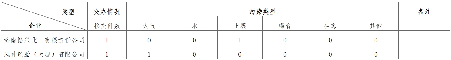 10月28日,中央第七生態環境保護督察組向中國中化控股有限責任公司轉辦第二批群眾信訪舉報件2件(來電舉報0件,來信舉報2件)。從信訪舉報件中的生態環境問題類型來看,涉及大氣1件、水0件、土壤1件、噪音0件、生態0件、其他污染0件。從企業分布上看,濟南裕興化工有限責任公司1件、風神輪胎(太原)有限公司1件。