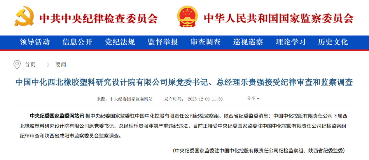中國中化控股有限責任公司下屬西北橡膠塑料研究設計院有限公司原黨委書記、總經理樂貴強涉嫌嚴重違紀違法,目前正接受中央紀委國家監委駐中國中化控股有限責任公司紀檢監察組紀律審查和陜西省咸陽市監察委員會監察調查。