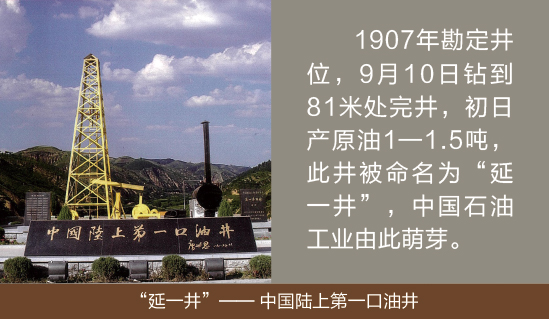 1905年 “延長石油廠”正式成立, 1907年9月鉆成中國陸上第一口油井——延一井,同年10月建成近代第一個煉油房,中國陸上石油工業由此發端。