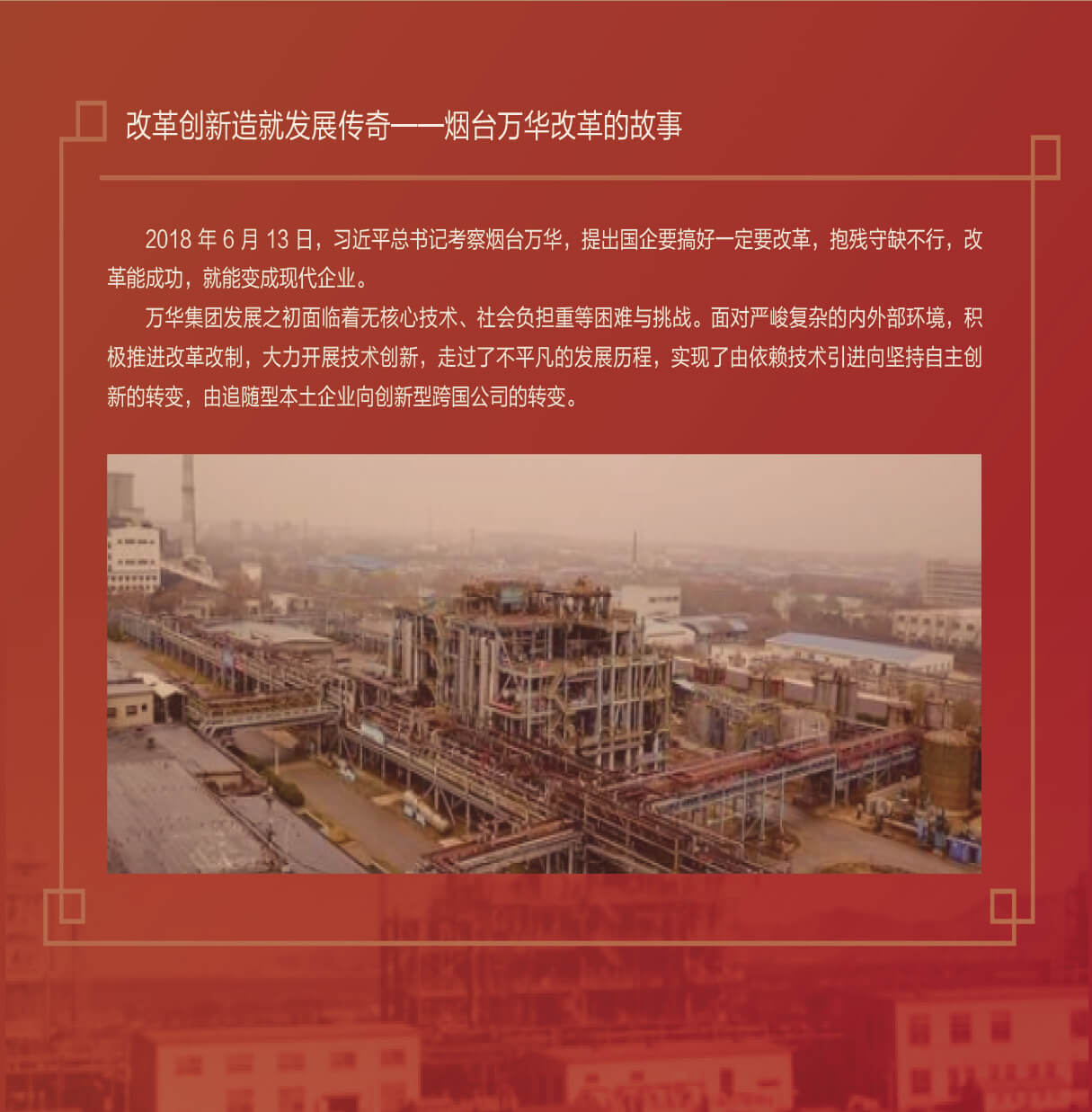 2018年6月13日,習近平總書記考察煙臺萬華,提出國企要搞好一定要改革,抱殘守缺不行,改革能成功,就能變成現代企業。