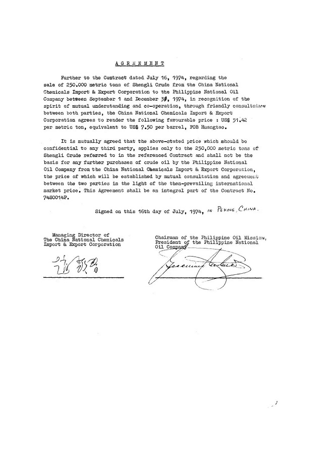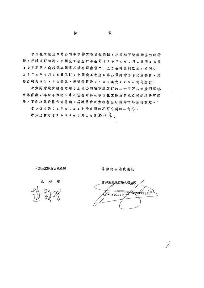 7月16日,中國化工進出口總公司張廷禹副總經理與來訪的菲律賓能源部長貝拉斯科簽訂首次向菲出口勝利原油25萬噸合同。這是勝利原油首次出口。
