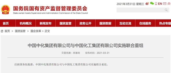 3月31日,經國務院批準,中國中化集團有限公司與中國化工集團有限公司實施聯合重組,新設由國務院國有資產監督管理委員會代表國務院履行出資人職責的中國中化控股有限責任公司,中化集團和中國化工整體劃入新公司。