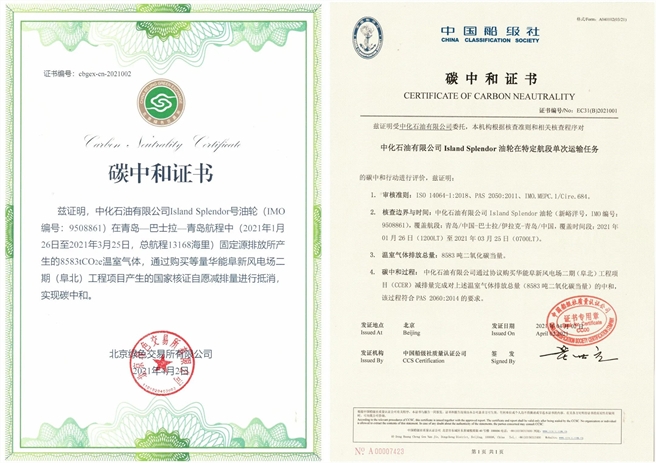 1月26日,油輪ISLAND SPLENDOR輪在青島港離港開航。這不是它的首次航行,然而這次行程意義深遠,它將進行一項全新的挑戰——完整航次碳中和。2月21日,ISLAND SPLENDOR抵達中東裝貨;裝貨完成后,油輪開始返航,途中克服復雜海況、惡劣氣象、時差跨度等挑戰,3月25日,ISLAND SPLENDOR卸港完成后緩緩駛出青島港,航行完美落幕。 經中國船級社質量認證公司對ISLAND SPLENDOR航次全過程碳排放核查,石油公司將核查得出的8583噸國家核證自愿減排量(CCER)在注冊登記簿上注銷,獲得ISLAND SPLENDOR該航次碳中和證書,實現了國內首例油輪航次碳中和。此次航次碳中和的全過程期間,中化石油公司通過碳盤查、節能減排、獨立第三方機構碳排放核查、購買及核銷國家核證自愿減排量CCER等嚴謹程序,實現了航次碳中和,這是公司對實現整個航運物流環節碳達峰、碳中和所作的初步嘗試,以期激勵航運物流業研究和開發新技術及綠色能源的決心。