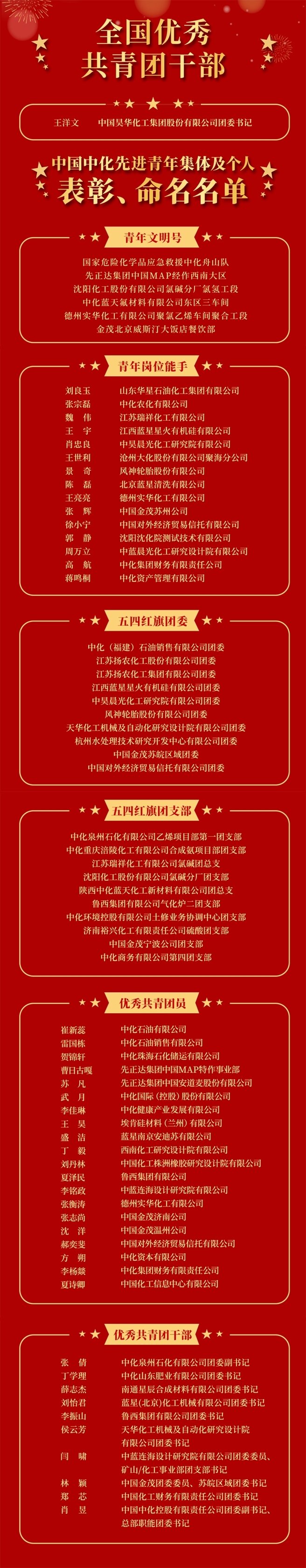 在五四青年節(jié)到來之際,為慶祝中國共產(chǎn)主義青年團成立100周年,充分發(fā)揮青年先進典型示范作用,激勵公司各級團組織和廣大青年建功立業(yè)、成長成才,經(jīng)層層推薦選拔,中國中化命名青年文明號6個,評選出青年崗位能手15人、五四紅旗團委10個、五四紅旗團支部10個、優(yōu)秀共青團干部10人、優(yōu)秀共青團員20人。公司1名團干部獲全國優(yōu)秀共青團干部稱號。 這些獲表彰的先進青年和集體在生產(chǎn)經(jīng)營主戰(zhàn)場、科技創(chuàng)新最前沿、重點項目第一線、國際化經(jīng)營大舞臺、基層實踐大熔爐中貢獻才智、實干苦干、沖鋒在前,充分發(fā)揮了青年生力軍和突擊隊作用,以青春建功獻禮黨的二十大,以昂揚姿態(tài)奮進偉大新征程。