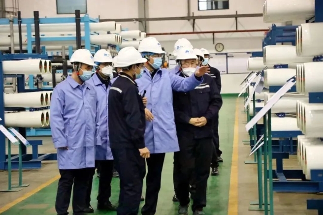 李凡榮一行調研了杭州水處理膜生產車間和裝備車間,實地考察企業在安全管理、生產運營、產能規模、產品定位等方面情況。