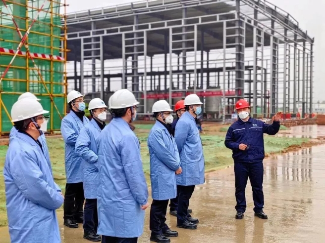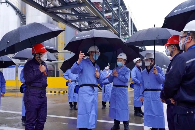 ▲在項目建設現場,了解新建電解液項目新工藝和總體進度 在浙江新能源,李凡榮指出,中國新能源行業處于快速發展期,我們要堅定不移往前走。在發展過程中,也要時刻保持敏銳和清醒,確保發展既快又穩。中化藍天鋰電材料團隊雖然來自五湖四海,但與中國中化文化融合后,很好地展現了新時代中國中化“精氣神”。