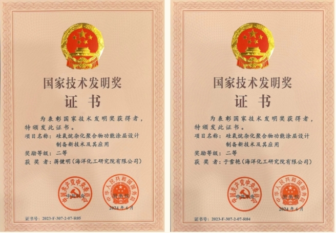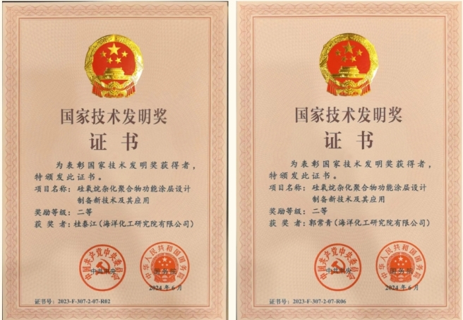 在建阿爾及利亞30萬噸/日海水淡化項目 通過擴大膜分離技術的應用場景,杭州水處理還實現船載海水淡化系統、海上鉆井平臺海水淡化系統的突破,消除海水淡化應用“盲點”。此外,杭州水處理正積極推動膜分離技術在工業廢水資源化、農村飲用水供水、新能源資源回收利用、電子工業級超純水、苦咸水淡化利用等眾多領域的推廣應用。 作為中國膜分離技術的發源地,杭州水處理此次為第二次獲得國家科學技術進步獎一等獎。早在1992年,杭州水處理就憑借“國產反滲透膜裝置及工程技術開發”項目獲得該獎項。此外,杭州水處理還曾獲得國家技術發明獎二等獎、國家科學技術進步獎三等獎。 國家技術發明獎二等獎 “硅氧烷雜化聚合物功能涂層設計制備新技術及其應用” 中國中化所屬海洋化工研究院有限公司(簡稱“海化院”)等單位完成的“硅氧烷雜化聚合物功能涂層設計制備新技術及其應用”項目榮獲2023年度國家技術發明獎二等獎。