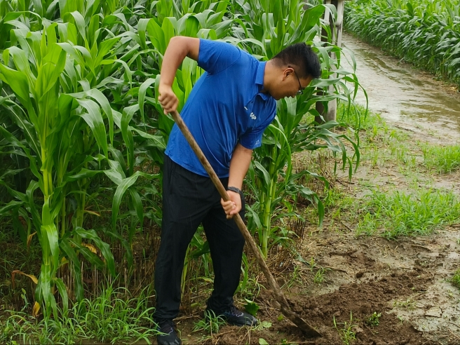 圖片中化農業MAP新橋技術服務中心幫助農戶排澇 伴隨著臺風“格美”的接近,河北石家莊新樂地區玉米受南方銹病和倒伏的風險加大。針對出現病害和倒伏風險的地塊,中化農業MAP石家莊新樂技術服務中心農藝師深入田間地頭,實地查看玉米長勢和病害情況,并為農戶提供針對性的解決方案。