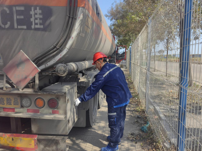 中化天津石油 國慶期間,中化天津石油員工堅守在工作崗位上,仔細(xì)檢查入庫車輛輪胎、靜電接地線等各項安全措施,以確保現(xiàn)場作業(yè)安全。