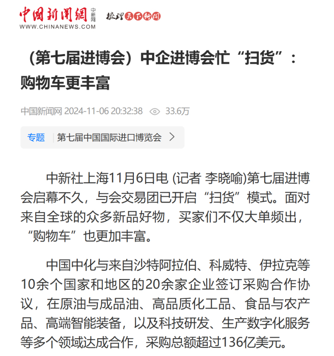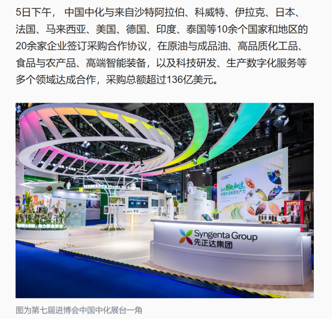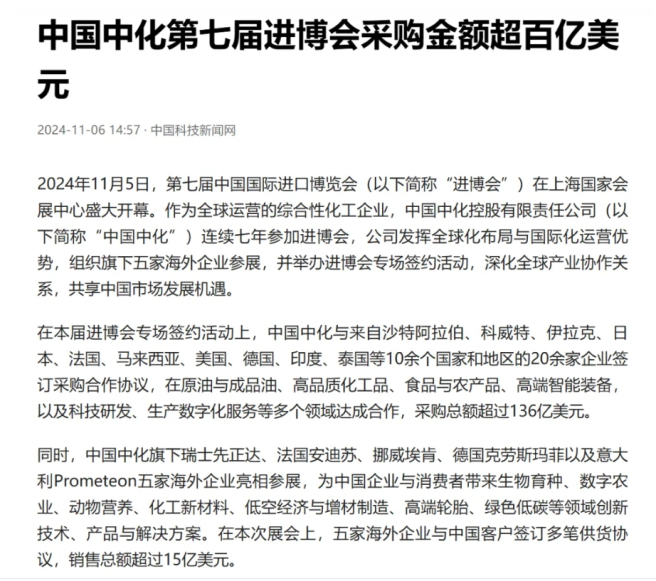 中國科技新聞網 《中國中化第七屆進博會采購金額超百億美元》