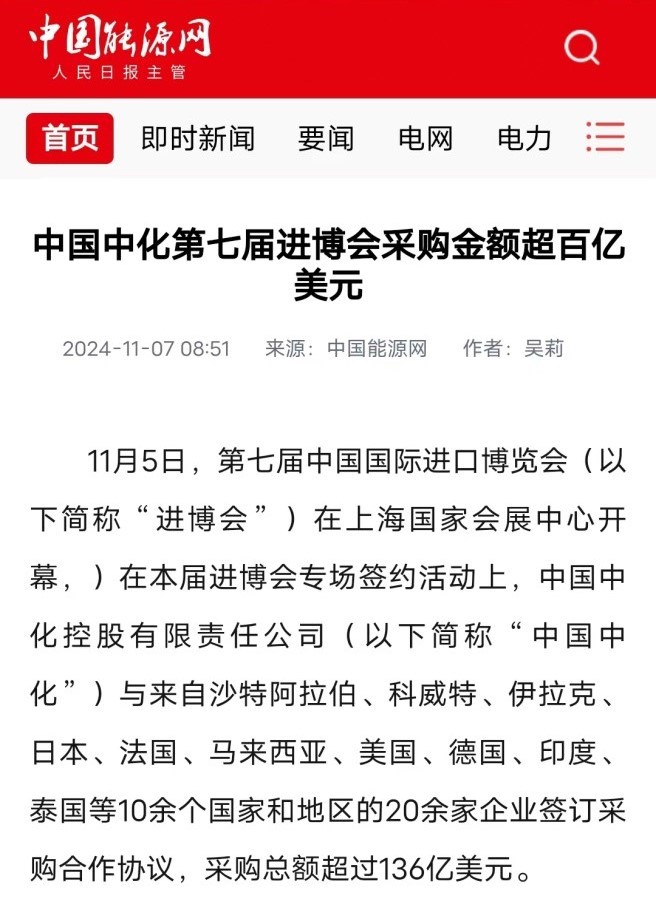 中國能源網 《中國中化第七屆進博會采購金額超百億美元》