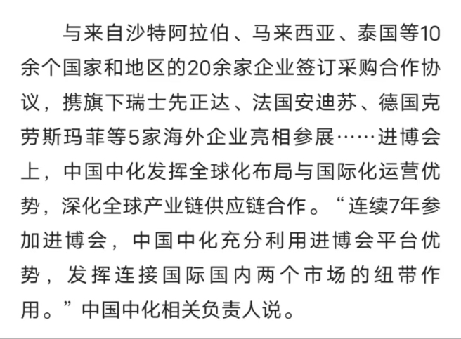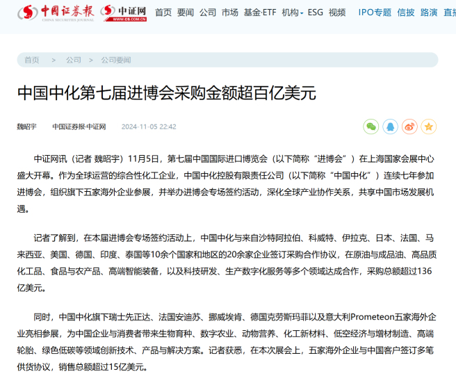 中國證券報 《中國中化第七屆進博會采購金額超百億美元》