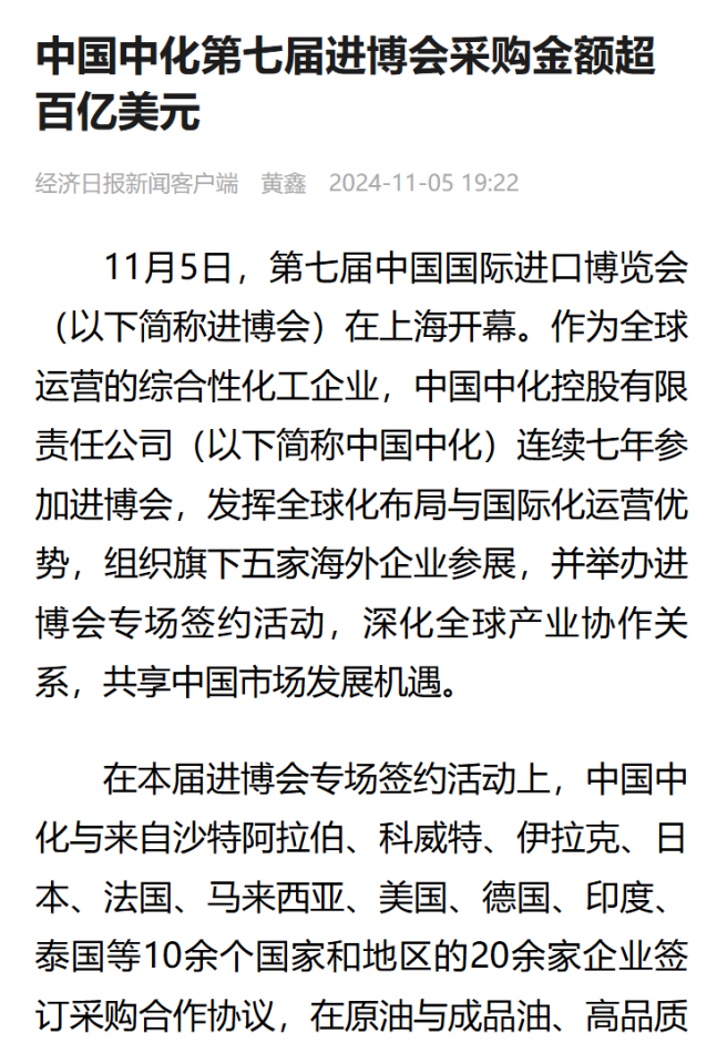 經濟日報 《中國中化第七屆進博會采購金額超百億美元》