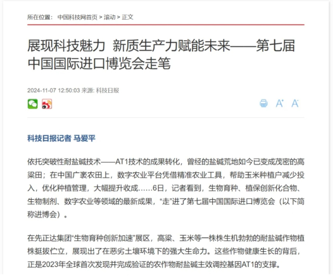 《從全球農場到中國餐桌 第七屆中國國際進口博覽會特別報道》節目介紹了先正達集團研發的能夠顯著加快育種進程的原創HI-Edit技術,以及基于AT1技術的耐鹽堿高粱等品種,充分展現了先正達集團在研發并應用“以種適地”技術方面的最新進展。 央視《朝聞天下》欄目報道 德國克勞斯瑪菲