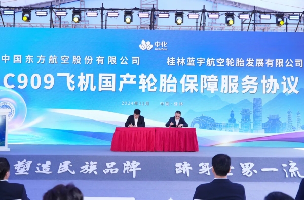 中國中化所屬桂林藍宇與東方航空、桂林航空和瑞麗航空分別就C909、A320及B737NG航空輪胎使用簽署產品應用協議 在會議現場,中國中化分別與中國商飛、南方航空簽署戰略合作協議,聚焦大飛機產業鏈建設、化工新材料研發、航空輪胎應用、運輸服務和綠色發展等領域不斷深化合作。中國中化所屬桂林藍宇與東方航空、桂林航空和瑞麗航空分別就C909、A320及B737NG航空輪胎使用簽署產品應用協議。