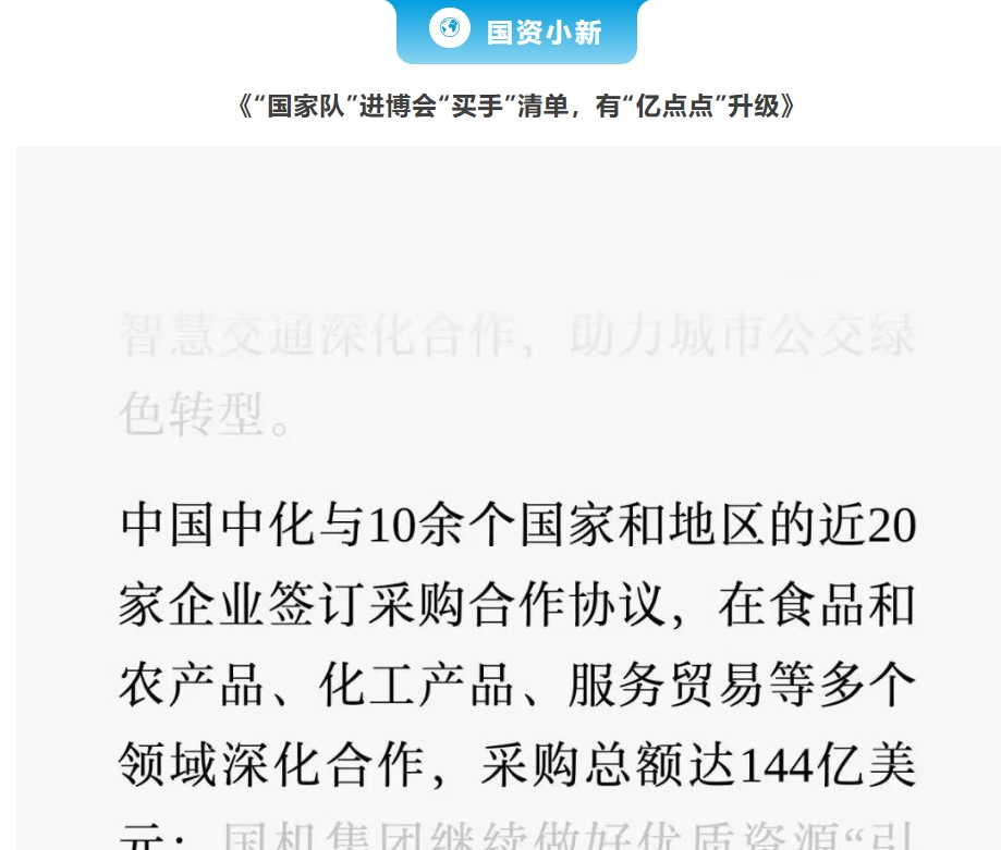 CCTV-1《新聞聯播》報道第八屆中國國際進口博覽會各項配套活動全面展開。中國中化第八屆進博會成交簽約儀式畫面亮相央視。 在簽約儀式上,中國中化與來自沙特阿拉伯、阿曼、哈薩克斯坦、法國、日本、韓國、比利時、馬來西亞、莫桑比克、泰國等10余個國家和地區的近20家企業簽訂采購合作協議,在原油與成品油、食品和農產品、化工產品、化工裝備、服務貿易等多個領域深化合作,采購總額達144億美元,再創歷史新高。