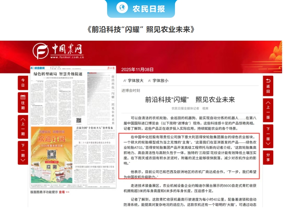第八屆進博會期間,中國中化旗下意大利Prometeon輪胎集團發布更有“中國味道”的企業品牌中文名稱“百得安輪胎”。百得安輪胎集團亞太區質量負責人穆云龍接受央視采訪時表示,此次參加進博會,百得安輪胎集團帶來了適用于農機、礦卡、新能源公交等領域的各類型輪胎,將深度參與到中國的發展中。