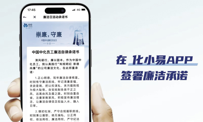 為持續厚植廉潔文化根基,切實筑牢廉潔文化建設群眾基礎,營造風清氣正的廉潔文化氛圍,大力弘揚新時代中國中化“精氣神”,中國中化自2024年起,將每年9月10日(諧音“就要廉”)設立為公司“廉潔文化日”。 在第二個廉潔文化日到來之際,公司各單位圍繞“崇廉?守廉”主題,精心組織、有序開展系列廉潔文化活動,持續營造人人“有感”、層層“倡廉”的良好氛圍,吸引廣大員工積極響應、全情參與。 同承諾? 公司上下簽署廉潔自律承諾書 從管理層至基層員工,從生產基地到科研院所,全體中化人線上線下共同簽署廉潔自律承諾書。活動啟動以來,已有逾8萬名員工通過化小易APP完成線上簽署。