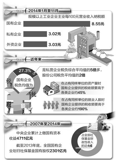 近日,在2014國有企業改革發展研討會上,國務院國資委研究中心主任楚序平表示,從2014年1月至11月中國規模以上工業企業主業每100元營業收入納稅率來看,國有企業稅負為其他企業的兩倍多,這一觀點引發熱議。 此前,有學者通過近幾年的數據研究得出,國有企業的稅負明顯高于其他類型企業。中國企業改革與發展研究會副會長李錦認為,在推進國企混合所有制改革和鼓勵民資進入壟斷性行業的背景下,如何實現國企與私企、外企稅負的平衡,為國企建立公平競爭環境是有關部門面臨的重要問題。 辯證看待稅負比例高 不久前公布的2013年中國私營企業500強納稅共計是4744億元,而中石化一家便達3363億元。2014年7月28日,財政部公布了“2013年全國國有企業財務決算情況”則更為全面清晰地顯示了國企稅負。報告顯示,2013年,全國國有企業(非金融類國企)上繳稅費3.8萬億元,比上年增長5.4%。 “可以計算一下,3.8萬億元除以2013年全國總稅收110497億元,全國非金融類國企納稅額占全國總稅收的34%。假設金融類國企納稅總額與非金融類國企持平,那么所有國企納稅總額占全國總稅收便是68%。假設金融類國企納稅總額只有非金融類國企的一半,所有國企的納稅總額也超過了全國總稅收的50%。”李錦說,“國企只占整個經濟規模的四分之一,從業人員僅占五分之一,但是國家的稅收有一半要靠國企。” 他分析認為,國企納稅占比高,主要因為國企管理更規范,稅收征管機制更健全。而近年來隨著國企公司治理結構的完善和管理水平的提升,競爭機制贏得發展實力,國企的利潤創造能力和稅收貢獻水平有了明顯提高。同時也應當承認,高稅收很多集中在某些特定行業,例如,資源壟斷行業往往需要繳納高額特殊稅種,這恰好又是央企集中的行業。國企利潤和納稅方面的快速增長,反映出我國過度依賴投資的經濟內生性結構失衡問題。 同時要看到的是,我國民營企業解決了75%以上的城鄉就業和90%以上的新增就業。國民共進是我國當前全面深化改革的重要立足點。 國企貢獻的不止是稅金 國企納稅貢獻只是國企履行社會責任的重要方面之一。長期以來,國有企業堅決服從中央宏觀調控,落實國家決策、保障經濟安全,保持了快速發展的良好勢頭。在國家和社會遭遇重大自然災害和危機時,國企沖鋒在前。 2007年至2014年,中央企業累計上繳國有資本收益4711億元。截至2013年底,全國國有企業劃歸社?;饑泄蓹?301億元,占全部社保基金財政性收入的近四成。2013年,中央企業結對幫扶239個國家扶貧開發工作重點縣。 在新常態下,國有經濟發展擔負著更加重大的歷史使命。服務國家戰略,國企新增投資額非常大,例如“一帶一路”等戰略落地需要投入支撐。 需要看到的是,目前國有企業的歷史遺留負擔還很重。推進剝離企業辦社會職能和解決歷史遺留問題,也需要建立成本合理的分擔機制。 厘清身份很重要 多年來,國企以利潤訴求為重還是以公共利益為重的爭論一直不斷。不同的目標,意味著不同的評價體系。只有厘清身份困惑,才能明確發展方向。這也是今年國企改革的一項重要內容。 “要為下一步國有企業公平參與市場競爭提供公正的平臺。”楚序平說。他認為,要深入做好準確界定不同國有企業功能工作,完善整體的配套評價體系;要對不同類別國有企業,明確主要特點、發展目標、改革方向,分類推進改革調整,加強分類監管、分類考核;進一步明確國有企業的國家所有權政策,明確國家對國有企業的重要政治目標、經濟目標和社會目標,明確對具體中央企業的商業目標,包括保值增值、經濟增加值等財務指標。他強調,“在分類之后,亟須盡快建立對國有企業的科學評價體系。” 李錦認為,隨著混合所有制改革和鼓勵民資進入壟斷性行業步伐的加快,國企與民企、外企處在同一條競賽起跑線上。90%以上央企都將劃分為商業競爭類。混合所有制改革后,企業營業收入的納稅率怎么確定,怎樣協調推進國企改革與財稅體制改革,進一步完善財稅體系,是個新議題。 作者:李予陽(本文章摘自1月6日《經濟日報》) |