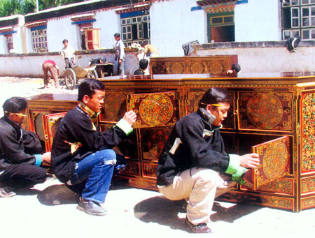 《中國西藏》雜志 2006年第4期 拉巴種植的西瓜喜獲豐收 根據中央的部署,2002年7月,中化公司對西藏日喀則地區崗巴縣實施對口支援。近四年來,中化公司共派出兩批援藏干部進藏工作,已投入援藏資金2100多萬元。 崗巴,藏語的意思是雪山附近之村莊,地處喜馬拉雅山脈北麓的崗巴縣,平均海拔 針對崗巴自然環境較差,人口少、居住分散,特別是農牧民缺乏致富技能等情況,為從根本上幫扶廣大農牧民擺脫貧困、增收致富,切實推動崗巴縣經濟、社會的全面發展,使援藏工作見實效、見長效,中化公司的援藏人員從探索和創新援藏模式入手,確立了“工程援藏與智力援藏相結合,推動經濟發展與轉變思想觀念相結合”的”二結合”援藏工作方針,把引領農牧民增收致富作為援藏工作的出發點和落腳點,把培養農牧民增強致富技能作為援藏的一項重要工作來抓。幾年來,通過多渠道、多層面實施培訓,崗巴縣已有一批農牧民徹底改變了原來的生產方式,不僅現金收入大幅度增長,而且擁有了持續增收致富的技能。 平措和拉巴夫婦是崗巴鎮雪村的農民,一家三口人過去只靠2.3畝土地種植青稞維持生活。 2005年,雪村的溫室大棚擴建為15座,雪村15戶農民在技術員的指導下用溫室大棚種植蔬菜,年均收入10000元以上,最高的一戶達15000元。 在海拔4700多米的地方種植蔬菜,不僅使部分農牧民率先走上致富道路,更重要的是使更多的人看到了致富的希望,給當地農牧民帶來了觀念上的改變,商品經濟的意識已經悄悄深入人心。在蔬菜大棚基地的旁邊,幾個藏族婦女正在鋪塑料薄膜,她們說看到種菜給鄰居們生活帶來的變化,很羨慕,也想試看學種菜。我問技術員宋延玲一共教了多少個學生, 旦巴平措在認真的學習藏族傳統繪畫 2005年10月,經中化公司援藏人員與日喀則職業中專學校接洽,該校專門為崗巴縣開辦了一個藏族傳統繪畫班,僅半年多的時間,參加學習的9個孩子已經能跟隨老師外出做室內外繪裝的活。在日喀則市崗多林波姆切居委會群培家里,記者看到了孩子們和他們的繪畫老師邊巴剛剛完成的作品,在這個藏式風格濃郁的院落里,繪滿了不同風格的吉祥圖案,雕梁畫棟、金碧輝煌。簡直不敢相信這里的部分畫作出自幾個月前還對繪畫一竅不通的孩子們。根據老師的介紹,學員畢業第一年到蓋房人家作畫,除管吃管住外,每天至少有30—40元的報酬,年收入在6000—7000元左右。以后出師后自己還可以帶徒弟,那時候收入每天可以達到100多元。 由于傳統的以一家一戶為生產單位及自給自足的生產方式造成的對勞動力的束縛,中化公司在崗巴縣實施培訓項目之初,每開展一個培訓項目時,都需要縣委、縣政府及有關部門進行大量的宣傳說服工作,有的甚至要挨家挨戶進行動員。自從大棚蔬菜上市及學習繪畫的學生利用假期在本村、本地開展有償服務以來,農牧民親眼看到了通過技術學習所帶來的實惠,學習技術的熱情隨之提高。2006年初,培訓木工報名通知由縣政府發至各鄉鎮后,報名者多達20名,超過了以往任何一個培訓項目的報名人數。為了鼓勵農牧民學習技術的積極性,中化公司援藏干部決定將這20名報名者全部送到西藏剛堅家具廠進行培訓學習。 木工班的學員們在西藏剛堅家具廠學習裝配家具 通過培訓讓廣大農牧民根據自身特點和愛好學到一門技術,從而拓寬增收渠道,增強致富能力,這一點已在中化公司援藏人員和崗巴縣廣大干群中取得了廣泛認同。為使這一觀念長期貫徹下去,形成一種長效機制,2004年崗巴縣成立了一個專門負責組織和管理培訓事務的崗巴縣培訓工作部,并設計制定出了技能培訓、素質培訓、助學金計劃三條面向全體崗巴縣干部職工和廣大農牧民的學習渠道及平臺,使培訓工作成為一項重要的對口援藏項目。 技能培訓是緊緊圍繞廣大農牧民生產、增收、創業開展的培訓,以期讓部分群眾從種地,放牧,打工等低收入的生產、生活方式中脫離出來,提高勞動技能,增加收入;素質培訓主要面向縣、鄉、鎮機關、事業單位和公共服務機構的人員,以短期專業學習、專業培訓及安排參觀和到對口單位實踐等方式,培訓其管理能力、專業水平、服務意識和市場經濟理念;助學金計劃的主要對象是崗巴縣的初、高中畢業生,以到內地中、高等職業學校學習為主,學習時間2-3年,最終取得中等或高等學歷。通過以上三個方面的培訓,一是使一批有能力、有意愿從事第二、三產業和養殖、種植業人才脫穎而出,使他們在個人致富的同時,帶動廣大農牧民共同致富,促進當地群眾思想觀念的轉變;二是不斷提高政府機關、機構為廣大農牧民服務的能力和水平;三是為崗巴縣培養一批具備較高素質的人才,改善當地的人才結構,為經濟的持續發展奠定人才基礎。 目前,中化公司在西藏和內地共建立了7個培訓點,在學和已學成畢業學員80多名。 日喀則職業中專學校,專業有藏族傳統繪畫、藏醫學,獸醫,護理、計算機等。目前在該校各專業學習的學生共20名。 西藏剛堅家具廠,從崗巴縣4鄉1鎮選拔出的20名農牧民正在該廠學習木工和家具繪飾。 日喀則地區人民醫院,目前有4名崗巴縣醫院醫生在該院學習骨科、CT、B超和放射。 江孜縣人民醫院,2004—2005年,有6名崗巴縣醫院醫生在該院分別學習外科、麻醉、計生和護理。通過學習,現在崗巴縣醫院已可以開展簡單手術,結束了崗巴縣凡手術必到