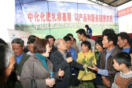 4月21日,中國中化集團公司為山東蒼山縣車輞鎮邢家村農民開展免費測土配方施肥服務,使農民真正實現種地上的“缺啥補啥”,這是中國農業科學院農業專家林繼雄教授在現場。邢家村是中國中化集團公司在全國各地建立的近200個科學施用化肥示范村之一,示范村建設是中國中化集團公司開展系列公益性為農服務的一項創新。 (韓冰攝)