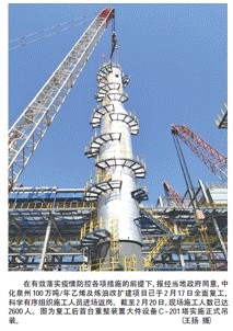 在有效落實疫情防控各項措施的前提下,報經當地政府同意,中化泉州100萬噸/年乙烯及煉油改擴建項目已于2月17日全面復工,科學有序組織施工人員進場返崗。截至2月20日,現場施工人數已達2600人。圖為復工后首臺重整裝置大件設備C-201 塔實施正式吊裝。