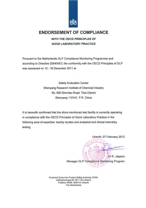沈陽化工研究院安全評價中心通過經合組織OECD成員荷蘭政府GLP認證認可