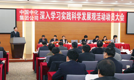 會上,劉總作動員報告,他對公司開展學習實踐科學發展觀活動提出以下要求:一是要認清重大意義,切實增強搞好學習實踐科學發展觀活動的責任感和使命感;二要緊密聯系實際,努力把中化集團貫徹落實科學發展觀提高到新水平;三是要精心組織實施,確保學習實踐科學發展觀活動扎實推進、取得實效。