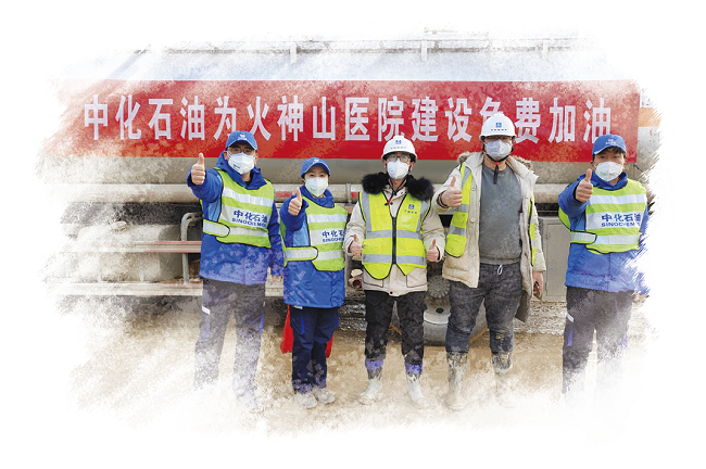 火神山醫(yī)院在建工地人員與送油員工為武漢加油