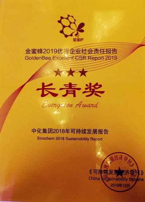 12月5日,在第十二屆中國企業(yè)社會(huì)責(zé)任報(bào)告國際研討會(huì)期間舉行的“金蜜蜂2019優(yōu)秀企業(yè)社會(huì)責(zé)任報(bào)告”發(fā)布典禮上,《中化集團(tuán)2018年可持續(xù)發(fā)展報(bào)告》榮獲“金蜜蜂”社會(huì)責(zé)任報(bào)告榜最高榮譽(yù)“長(zhǎng)青三星獎(jiǎng)”。
