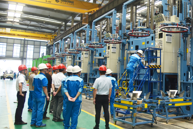 本次交付的液壓硫化機主機結構緊湊,占地寬度較框架式機型縮小超10%,通過結構及控制創新,使設備非硫化時間控制在60秒以內。此外,該機型應用先進的液壓系統和伺服系統,實現按需輸出及精準數字化控制,進一步提升設備智能化、綠色化水平。