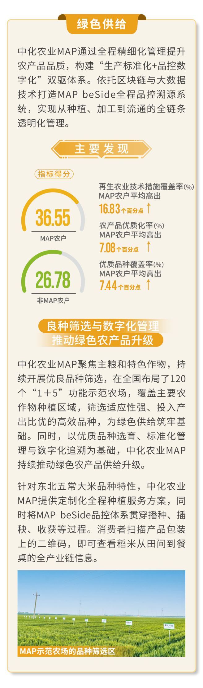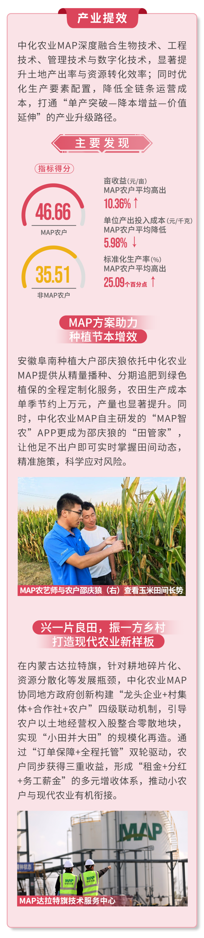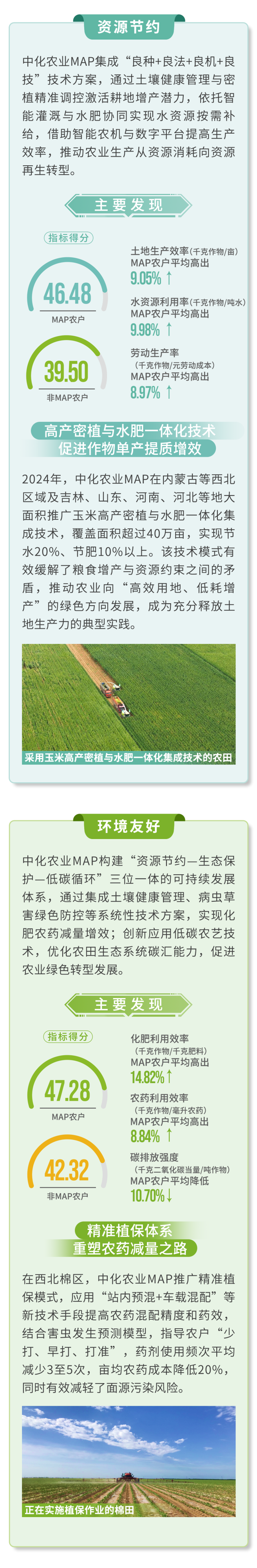 報告采用隨機抽樣、線上線下相結合的方式,聚焦玉米、小麥、水稻、棉花、馬鈴薯等核心作物,從“資源節約、環境友好、產業提效、綠色供給”四大維度綜合評價中化農業MAP推動農業綠色高質量發展情況。中化農業MAP已連續五年發布此項報告,充分展現其對農業可持續發展的深入探索與長期承諾。