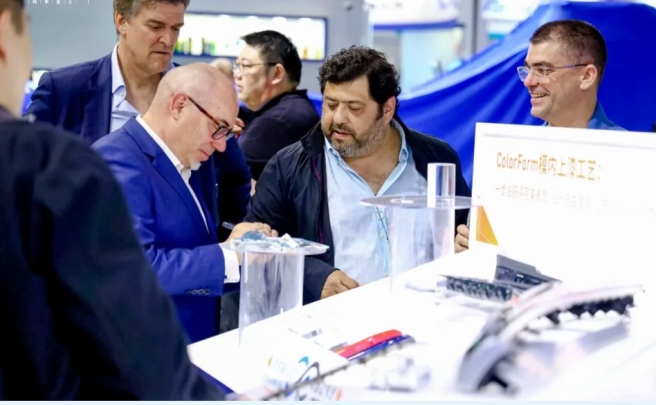 展會現(xiàn)場,克勞斯瑪菲通過領(lǐng)菲®precisionMolding 320全電動注塑機(jī)結(jié)合RimStar發(fā)泡設(shè)備,協(xié)同中國中化旗下其他企業(yè)提供的原材料,現(xiàn)場演示ColorForm模內(nèi)上漆工藝生產(chǎn)表面飾板,引來眾多觀眾駐足參觀。