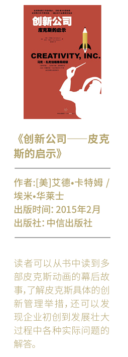皮克斯公司(PIXAR)可以說是一家“骨子里流淌著創(chuàng)新的血”的企業(yè)。但凡對當(dāng)代電影市場有所了解的人都知道,皮克斯公司幾乎每一部作品都是動畫電影史上的經(jīng)典,并傲居票房榜單高位。《創(chuàng)新公司——皮克斯的啟示》一書,對這家公司的創(chuàng)新因子進行了詳盡的闡述。