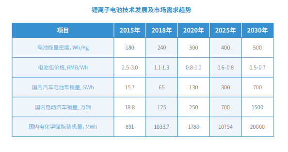 鋰離子電池能量密度高、循環(huán)壽命長(zhǎng)、綠色環(huán)保,逐漸成為電動(dòng)汽車及風(fēng)能、太陽能儲(chǔ)能的最好選擇。在技術(shù)快速進(jìn)步及國家補(bǔ)貼政策的大力推動(dòng)下,鋰離子電池能量密度不斷提升,價(jià)格不斷降低,市場(chǎng)銷量迅速擴(kuò)大。中國是世界上新能源汽車保有量最多、風(fēng)能太陽能發(fā)電裝機(jī)容量最大的國家。作為新能源產(chǎn)業(yè)鏈的核心環(huán)節(jié),發(fā)展鋰離子電池意義重大。相關(guān)的技術(shù)發(fā)展和市場(chǎng)需求趨勢(shì)如下表。