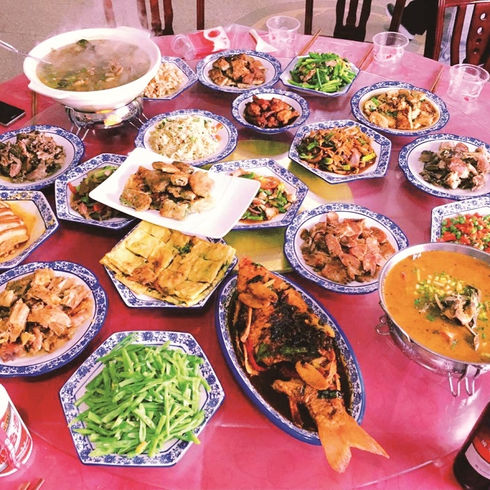 冷盤、熱炒、大碗依次上席,不能亂了順序。香噴噴的肉丸子、滾燙的拔絲,這些家常難見的大菜極受歡迎。不過最讓人愛的還是最后上的那一碗湯。湯里有些薄薄的雞蛋皮子,還有些木耳、皮肚,看著平常,味道卻極鮮,在家里無論如何也做不出這番味道。