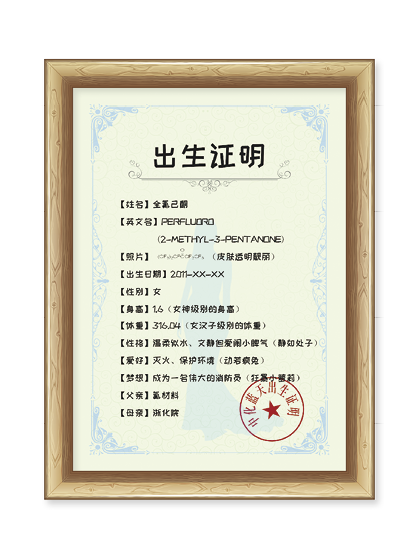 Hello Everyone,我叫“酮酮”,學名叫全氟己酮,這是一張貨真價實的出生證。