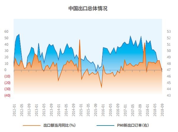 國內(nèi)方面,2018年11月制造業(yè)PMI(采購經(jīng)理指數(shù))新出口訂單指數(shù)為47.0,已連續(xù)6個月低于50的“榮枯線”(采購經(jīng)理指數(shù)和企業(yè)家信心指數(shù)的臨界值),先行指標表明我國出口增速正趨于萎縮。