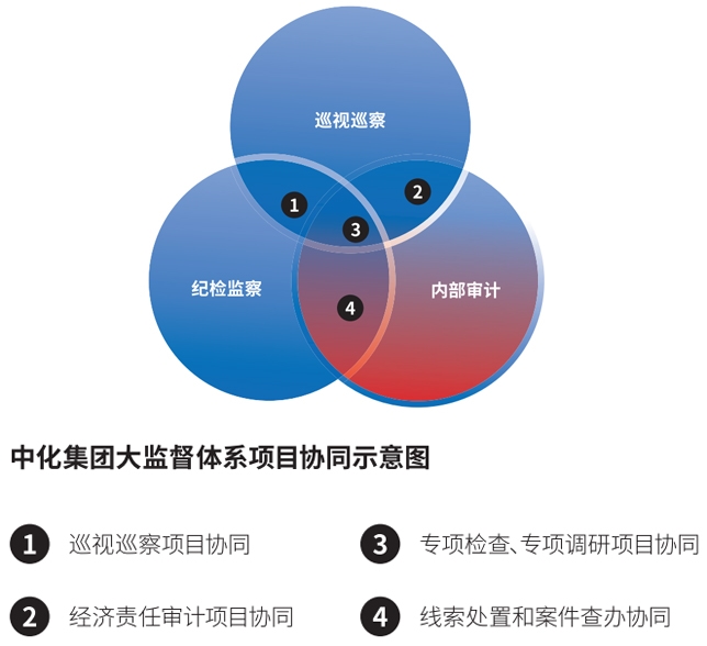 《中化集團總部大監督體系(1.0)版》對大監督體系進行了闡釋。概括而言,一是集團設立黨組織、董事會、經理層,規范公司治理結構,建立健全權責對等、運轉協調、有效制衡的決策執行監督機制,充分發揮黨組織的領導作用、董事會的決策作用、經理層的經營管理作用;二是集團統籌巡視巡察、紀檢監察、內部審計專責監督力量,建立監督工作會商機制,強化對黨組織、董事會、經理層和領導人員廉潔從業、行使權力的監督,發揮監督合力,提高監督效能。