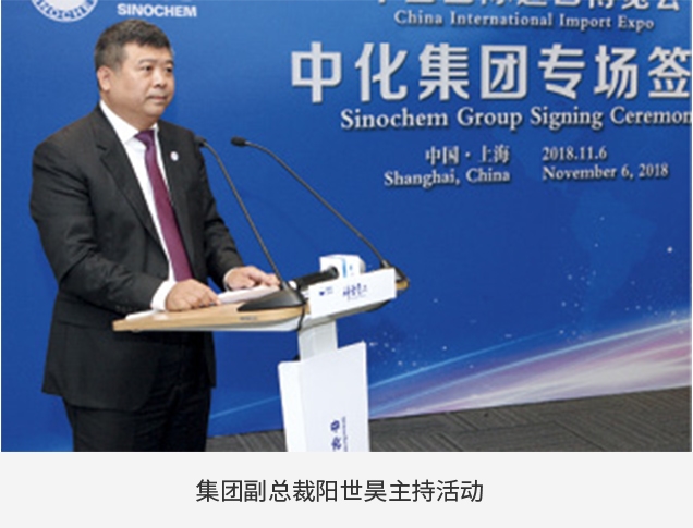 11月6日,集團舉辦專場簽約活動并發布首屆進博會交易成果。活動由中化集團副總裁陽世昊主持。此次進博會,中化集團與來自美國、墨西哥、俄羅斯、法國、挪威、澳大利亞、沙特阿拉伯、科威特、以色列、埃及、約旦、韓國、印度、孟加拉、印度尼西亞、菲律賓和中國臺灣等17個國家和地區的合作伙伴現場簽訂采購協議,進口原油、樹脂、脂肪酸等19種商品,采購金額超過113億美元。