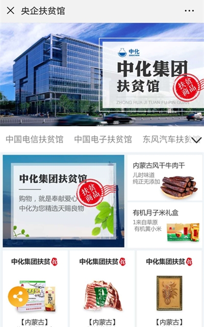 10月16日,在"國家扶貧日"到來之際,由國務院扶貧辦指導建設的中國社會扶貧網舉辦“互聯網+”社會扶貧論壇,正式啟動央企扶貧館進駐儀式。中化集團等10家單位作為首批中央企業入駐該館,與電商開展扶貧合作。即日起,中化集團對口幫扶的內蒙阿魯科爾沁旗等地所產的雜糧、羊肉、風干牛肉、皮雕等土特產品開始通過網絡正式售賣。